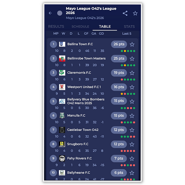 As the O42s League finishes up and last nights 3-1 loss to Ballyvary BB, Town's men placed respectfully in the league and excercised the joints throughout the season! . Well done to everyone involved and congratulations to Ballina Town FC on winning the League.