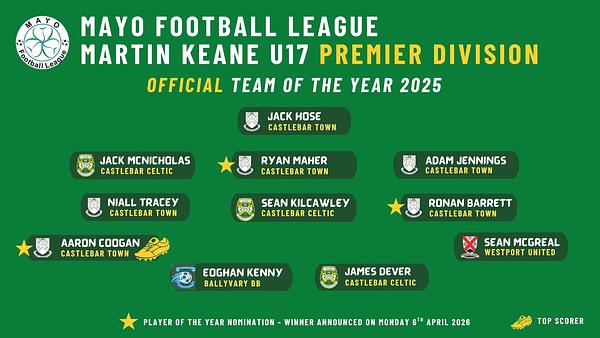 The Mayo Football League today announced the Martin Keane U17 Premier Division official Team of the Year Recipients. Huge congratulations on being selected to: JACK Hose, RYAN Maher, ADAM Jennings, NIALL Tracey, RONAN Barrett & AARON Coogan